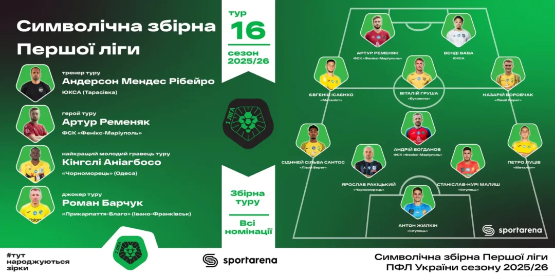Портал Sport Arena обрав футболістів «Фенікса-Маріуполя» Андрія Богданова та Артура Ременяка до символічної збірної шістнадцятого туру чемпіонату VBET Першої ліги України.